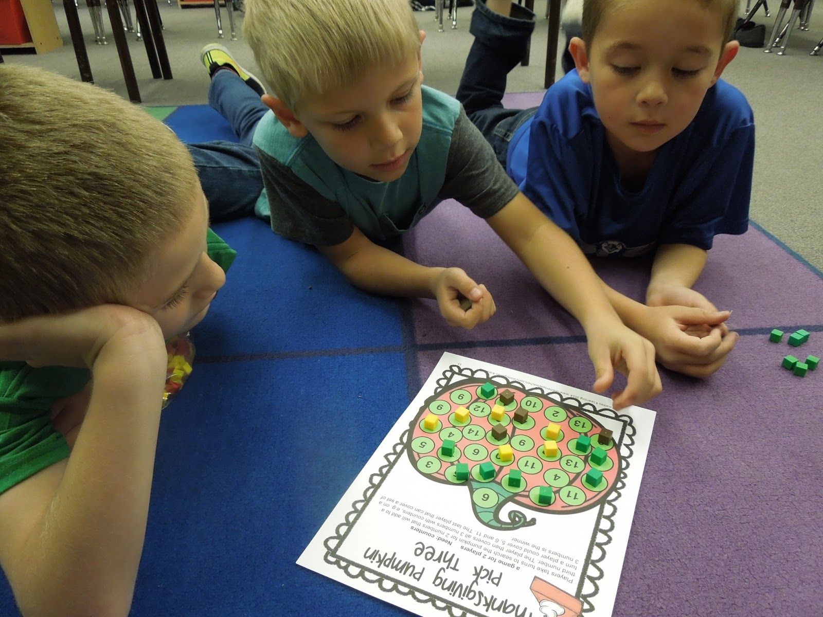 After the light bulbs started turning on with the color mixing idea, we have been practicing fact families as many ways as possible. We have been doing many games on the interactive whiteboard and practicing writing fact families on our old fashion whiteboards. We have been taking quizzes using the iPads so I get instant feedback on how the children are understanding. I am finding that the students are getting stronger everyday but we still need some practice. Another way we are practicing is with a Thanksgiving math partner game. The students have to cover three numbers in the fact family on a pumpkin. When there isn't any related facts left, the game is over.